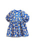 Stunning jacquard party dress in rich royal blue and gold floral. Voluminous sleeves with elastic at the elbow Scoop neckline with a zipper back. Fully lined skirt creates the perfect silhouette for this mini. Pockets, of course.