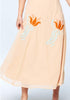 Dreamy peach silky A line skirt embroidered with orange and blue tulips! Cut on the bias so it hugs every curve perfectly. Side zip & fully lined. Midi length. Pair any top with it to create a fun, whimsical fashion. we recommend the coordinating Peach Bellini Vest for a fabulous set look!