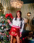 Just the cutest holiday sweatshirt. White with sequin holly berries among a striped backdrop. Front, back & sleeves are covered in sequins! Red & white striped ribbed neckline, hemline & cuffs. Sits at the natural waist. Such a fun way to get into the holiday spirit!!!