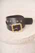 Wide black faux leather belt with a gold-tone braided metal buckle.