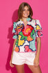 A favorite shape top in a vibrant print by Alden Adair. Poof sleeves with crochet trim detail at the neckline & hem. Stand up collar and a boxy style body. Great to front tuck or leave out for a crisp look.
