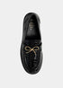 The Gold Bow Loafer brings refined polish with a sleek edge. In glossy black croc-embossed material, this classic silhouette is upgraded with a square toe and gold hardware for a sharp, fashion-forward finish. Perfect for elevating your everyday basics or completing your workwear rotation.