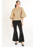 Metallic Tweed balloon sleeve Top with a round neck and 3/4 puff sleeves Same fabric metallic gold buttons Front snap closure. Peplum hem. The perfect holiday top to pair with anything in your closet. Gold is just a shiny neutral after all.............