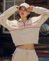 This tan half zip is cute and cozy. With red piping across the front for a fun pop of color, this top is perfect for lounge and travel. Part of a matching set!