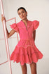 One of our all-time favorites is the Baba Dress. This time, in a stunning coral shade with the signature scalloped detailing in whites, pinks and purples. Short sleeved, short dress and flowy skirt. It's button down and has a deep V-neck. The feminine touch of this piece is given by its cinched waist. The best part? The pockets!