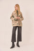 Stunning short shearling coat with bronze and green embroidered floral motifs and sequin embellishments. Turn-down collar and hooks to close.