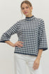 This structured top features a classic and classy black and white gingham print. With a mock neck and 3/4 sleeve, it's a fun pop of print.