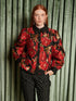 This is really special. It's a blouse and a jacket in one garment. Beautiful jacquard print in rich red with gold accents. The details are what will make this a standout. The collar, cuffs and front button placket are a sturdy knit with lovely black & gold buttons. Fully lined. The balloon sleeves make it great for layering a holiday sweater underneath!