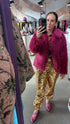 This funky magenta faux mink is cropped and perfect to wear casually or for an occasion. Hook and loop closure.