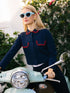 Is it a jacket or a cardigan? Both! Slick navy accented with red blanket stitching at the collar and pockets. Button closure. Cropped style to pair with your high waisted bottoms and dresses.